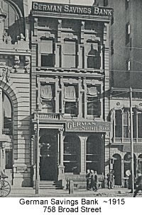 Newspaper Articles February 8, 1903 - The Board of Directors of the German Savings Bank -- A Remarkable Picture Incorporated March 18, 1871 From: "Newark Illustrated 1909-1910" Published by Frank A. Libby 1909 The German Savings Bank of Newark, NJ is one of the bulwarks of pecuniary fortification that has been steadily built these 39 yeas with consistent concord with the highest standards in monetary affairs. They have assets of over 5 million dollars and over 14,000 depositors. Gottfried Krueger is the president of this popular savings institution.
