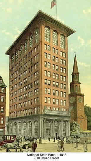 Chartered on January 28, 1812. Re-organized for 20 years, from 1885 under National Banking Act. From: "Newark, the City of Industry" Published by the Newark Board of Trade 1912 One of the more recent office buildings to be erected in the city is the new National State Bank building at the southeast corner of Broad and Mechanic Streets. It was designed to provide suitable quarters for the bank and also to produce an income commensurate with the value of the plot. The building occupies the site of the old iron structure, long a landmark of the city. The new building is 12 stories high and has a frontage of 49 feet on Broad Street and 88 feet on Mechanic Street. The bank occupies the entire first floor, including a mezzanine on the south side, which provides very spacious and comfortable quarters for its increasing business. The basement is arranged to contain a modern safe deposit vault which is for the use of the bank. The upper stories are divided into offices with every modern convenience, and are served by three elevators, with an entrance on Broad Street through a roomy corridor on the ground floor. The construction is fireproof throughout, the quartered oak trim and floors are treated with a fireproofing composition. The halls and other public parts of the building and banking rooms are finished with marble floors and wainscotings. As the National State Bank has been in existence for 100 years, it is peculiarly fitting that the celebration of its centennial should be marked by the erection of this beautiful new structure. It was on February 8, 1812, when this bank was formed. Business was commenced June 1, 1812. In the same month the board decided to purchase a site for the future home of the bank, to erect upon it a suitable banking house. The place selected was the present site upon which the bank now stands. The lot had a frontage of 49 feet on Broad Street and 117 on Mechanic Street. It, however, did not include all the property that the bank now owns. For what was then purchased the directors agrees to pay $2,800, and on July 21 of that year the deal was closed. Soon afterward work was begun on the banks' first home of its own. The building cost about $5,000, and the bank took possession on March 3, 1813. The capital stock actually paid in on November 9, 1813, was One Hundred Thousand Dollars. Along the early part of 1868 the institution began to feel the need of more room for its growing business, and it accordingly erected a new building on the rear of its property for its own occupancy, then built on the Broad Street front, another structure to rent for office purposes, having an entrance to the banking room through the centre form Broad Street. These buildings had been in constant use until recently torn down, and were replace by the new $350,000 12 story structure now occupied by the bank.