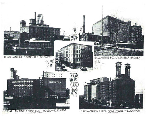 From “Newark and Its Leading Businessmen” 1891 If the testimony of the great majority of competent physicians, and the results of practical experience, are to be regarded as conclusive, then it may be stated as an established fact, that the reasonable use of pure malt liquors is as healthful as it is agreeable. The demand for such liquors has increased with phenomenal rapidity of late years, and some idea of its present magnitude may be gained from a few figures concerning a representative establishment engaged in their production - that of Messrs. P. Ballantine & Sons. The business conducted by this firm was founded some forty years ago, and their productions have long held their present leading position in the market, being conceded by the chemists, by expert brewers, and by consumers in general, to have few equals, and no superiors, either in this country or elsewhere. There is certainly every reason why they should be equal to the best in every respect, for the firm have exceptional facilities, use the choicest selected material, and make it a rule to have every detail of the various processes incidental to production carried on by experienced workmen under close and skillful supervision. The premises utilized cover an area of about ten acres, and a number of substantial buildings, from four to eight stories in height, are made use of, the ale and porter brewery being located at the foot of Fulton Street, while the plant employed in brewing Ballantine & Co's famous "export lager beer," is located on Freeman Street. Fine XX and XXX ales and porter, stock, India pale and Burton are produced at the Fulton Street brewery, and average of 1,200 barrels of ale being sent out daily, while 7,000 barrels of lager beer are sent to New York every day, besides a large number distributed among other cities. Employment is given to about 1,200 men, and thought 200 horses are owned by the firm, and used to convey the product to the railway, a large proportion of that work has to be done by hired teams. In spite of its great magnitude, the business has by no means reached the limit of its growth, for orders are rapidly and steadily increasing, and will probably continue to do so as long as the firm maintain their present policy of keeping the product at the highest standard of excellence. "Newark - The City of Industry" - 1912: The THREE RINGS are known the world over as the trade-mark of P. Ballantine & Sons, Brewers and Maltsters, Newark, N. J., U. S. A. This trade-mark was adopted in 1879 and was suggested by the chief characteristics of the product of their breweries -- purity, strength, flavor. The nucleus of the great business of the Ballantine Breweries was formed in Albany, N. Y. in 1826, by the late Peter Ballantine, who removed to Newark in 1840. The lager beer brewery was started in 1879. To meet the needs of the rapidly growing business, the corporation of P. Ballantine & Sons, embracing the ale, lager beer and malting business, was formed in 1883. Since then the annual output has increased steadily until it now amounts to over half a million barrels yearly. Several years ago the manufacture of Ballantine cereal syrup for the use of bakers was inaugurated, which product is used throughout America and has met with constantly increasing success. The ale brewery, malting, elevator and cereal syrup buildings of the Ballantine plant are situated on Front, Fulton, Rector streets and the Passaic river; the lager beer brewery and bottlery are located on Freeman, Christie, Oxford, East Ferry and Bowery streets, Newark. all these buildings cover twelve acres of ground, are equipped with the most modern and model machinery, and contain great storage capacity necessary for the enormous output and insuring the thorough ripening of the Ballantine products. The entire brewing and bottling plant is subject to the supervision of the United States government. As Ballantine resources are ample, as Ballantine capacity is enormous, and as Ballantine Ales and Beers are never made from anything but the very choicest grain, barley-malt and hops, the purity of the Ballantine products is beyond the veriest shadow of doubt. Expert brewers constantly supervise every process, and absolute cleanliness is observed in every operation. All Ballantine's Ales and Beers are thoroughly matured and fully ripened in order to perfect their condition and retain the distinctive flavors at their very best. No preservatives are ever used in any one of the Ballantine products. None is needed. There is no necessity for argument as to the superiority of brewery bottling over that done elsewhere. Ballantine's Ales and Beers are all bottled at the brewery in a specially designed bottling house, equipped with the best modern machinery. The beer is conveyed to this house in bright copper pipes, under the supervision of U. S. Government officials, and is stored in glass-lined steel tanks. The latest bottling machinery thoroughly cleanses, sterilizes, fills and seals the bottles without the possibility of contamination. The beer does not once come into contact with air in its passage from the brewery storage vats through the pipe line and the bottling machinery into the bottles in which it is hermetically sealed. Purity of product is thus absolutely assured. Every sealed bottle of Ballantine's Beer conforms in all respects to the requirements of the United State Pure Food Law. Finally, handsome labels and careful packing complete the attractive presentation of this perfectly made and valuable product. From Pete Bruno: The company was founded in 1840 in Newark, New Jersey, by Peter Ballantine (1791–1883), who emigrated from Scotland. The company was originally incorporated as the Patterson & Ballantine Brewing Company. Ballantine rented an old brewing site which had dated back to 1805. Around 1850, Ballantine bought out his partner and purchased land near the Passaic River to brew his ale. His three sons joined the business and in 1857 