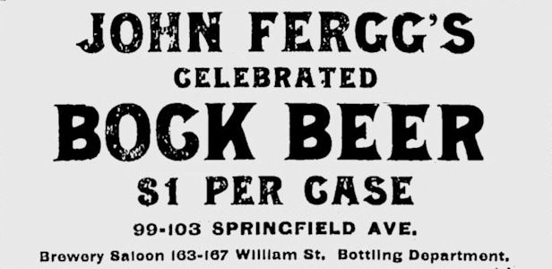 From Newark, New Jersey's Greatest Manufacturing Centre, Illustrated 1894: This brewery which is situated on 99-103 Springfield Avenue and 163-171 William Street is the most successful concern in the city. Having opened the brewery with beer of his own manufacture December 23, 1893, Mr. Fergg has shown his remarkable intelligence in the manufacture of beer, that it can now be found in the finest cafes and saloons in the city. Since Mr. Fergg owned the brewery several additions and considerable improvements have been made and the plant has been fitted up to allow him to sell 15,000 barrels per year. The reason the product of this brewery is demanded everywhere is because it is brewed from the best malt and choice Bohemian hops, not a bit of substitute for either malt or hops being used. Besides Mr. Fergg's superior lager beer he has a beer called "Johannis Beer," which has formed for itself such a reputation, that it can be found in almost every household. It is especially liked by the American class of people who certainly are, beside the Germans, the best judges of beer. Speaking of the brewery it would probably be interesting if it should be described. The brew house consists of a fifty barrel kettle with mash tub, hop jack, pump, etc., to complete the outfit. In the fermenting cellars there are thirty sixty-barrels fermenting vats which is more than enough for the capacity of the kettle. The "Rut" cellar contains gigantic casks which holds from one hundred to two hundred barrels. Here is where the beer lies for months during which time the beer gains its age, which as everyone knows is very important. Then there are over fifteen chip casks of seventy barrels capacity. This brewery has a twenty-five ton ice machine, a boiler, air pump and other machinery which are necessary for a brewery. The office is at 169 William Street. A stock of fine horses are in the stable which by good management is kept clean and healthy. Connected with the brewery is a saloon, which is situated at 102 Springfield Avenue where Mr. Fergg receives his friends, who come in large numbers. Mr. Fergg is a well known New York brewer, but for the last ten years has been connected with Hills Union Brewery Company. His greatness as a brewmaster can be shown when it is proven that from a brewery of 15,000 barrels annual sales he has increased its annual yearly sales to 60,000 barrels in four years. When the Citizen's Brewing Company appointed receivers, Mr. Fergg at once negotiated to buy the concern, which soon afterward was turned over to him. We all wish and hope that Mr. Fergg make a success in his new enterprise. He was born in Kempten, Bavaria, near the boarder of Switzerland in 1848, and came to this country in 1859. He has been employed in several New York breweries and as brewmaster he can pride himself as having been at the head of the leading New York concerns. He is a very clear minded man who knows a good thing when he sees it. He, being a member of eight singing societies, including Arion and Eintracht, four lodges of different orders besides many other societies, has made himself very popular and certainly possesses many friends. In his son Joseph Fergg who is manager he has a very excellent aid. he is a thorough brewer and has a keen business intellect and carefully supervises the operations and transactions of the firm.