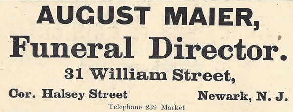 Twentieth Century G. Maier & Son Messrs. G. Maier & Son is the title under which a high class undertaking business has been conducted since 1882, at the corner of Halsey and William Streets. The senior member of the firm, Mr. Gottlieb Maier, was born in Oberhausen, Wuertemberg, Germany, November 10, 1827, and his father, Leonhard Maier, being a shepherd, he was raised in that work. He learned the trade of blacksmith in Germany which means that he learned it in all its branches, an apprentice there not being allowed to go with only part of a trade learned as is often the case in this country. Another thing he learned in the Fatherland was how to live the life of a soldier, nearly six of his best years having been spent in the German Army, including the time of revolution in 1848. He was one of the sharp shooters and has two medals, one from Baden, the other from Wuertemberg, for meritorious services. He came to America nearly fifty years ago. He worked as a carriage maker for a time with Quimby & Co., and as an axle maker with the Tomlinson Spring and Axle Manufacturing Co. for many years until the present partnership was formed. His son and partner Mr. August Maier, who was born in Newark in 1861, was educated in the Third Ward School and took private lessons from Prof. Howard. At the age of fourteen he started to learn undertaking with Mr. A. L. Erb and in the seven years spent in his service mastered every detail of the work. He has, too, that rare qualification of knowing how to enter the homes of distressed families and care for the bodies of their loved ones without adding to their grief, his natural tenderness and sympathy seeming to have a quieting and soothing effect. In the technical parts of his work, especially in embalming, he has no superior, having taken the course of Sullivan's School of Embalming three times. Added to this he takes the most intense interest in every arrangement for a funeral, so that under his care an error or omission is almost an impossibility. He has his own horses and coaches, using nothing but rubber tires. He holds membership in the Evangelical Protestant Church in which he was christened and confirmed by Rev. Dr. Lehlbach. He is well known if fraternal circles and is an esteemed member of the Masonic Order.