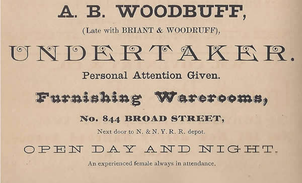 From: Industries of NJ 1882 E. B. Woodruff Undertaker, No 844 Broad Street. For the past ten years Mr. Woodruff has filled one of the most prominent positions in the confidence and patronage of a wide circle of the citizens of Newark as on of her leading undertakers, the duties of which he has discharged with courtesy and efficiency to the utmost satisfaction of his patrons in the most trying hour of affliction. The store and work shop is a brick building 20 x 100 feet in extent, and is fitted up and fully equipped with the necessary implements for the business. An ample stock is carried of everything in the undertaking line, the estimated value of which is $5,000. Embalming and preserving is done, and caskets, coffins, refrigerators, and ice boxes are kept. A large connection has been formed, and the business done is estimated at $30,000 per annum, this being the best test of the high esteem Mr. Woodruff is held in and his popularity in this business. In 1869 to 1872 he was a member of the Board of Freeholders, and Coroner of the County of Essex from 1878 to 1881. From: Newark and It's Leading Businessmen 1891 E. B. Woodruff Undertaker, No 846 Broad Street, Newark, N. J. Although good sense forbids there being too much stress put on the thought of death under ordinary circumstances, still it is but the part of common prudence to be prepared to act with promptness and decision in any emergency, and, therefore, we feel that the information that we propose to supply regarding the establishment conducted by Mr. E. B. Woodruff at No. 846 Broad Street, will be neither out of place nor neglected. The establishment in question was founded in 1872, by Messrs. Briant & Woodruff, and continued by these gentlemen until 1880 when Mr. Woodruff assumed the entire control of affairs. He is fully prepared to assume entire control of funerals and to supply everything required at equitable rates. All branches of the undertaking profession are carried on in a strictly first class manner. The premises occupied at the above address are appropriately fitted up for the purposes for which they are used. Three reliable assistants are employed, and every facility is at hand that is necessary to the furnishing undertaking business. From: Newark, NJ Illustrated 1893 E. B. Woodruff Among the undertakers of the city of Newark few have risen to a more deserved prominence than Enoch B. Woodruff, whose offices and warerooms are at No. 846 Broad Street. Here at all hours of the day and night he is found ready to respond to the call of those who are so unfortunate as to need the services of an undertaker. An experienced female is always in attendance. For convenience of location the establishment has few equals and no superiors. Enoch B. Woodruff is one of the oldest undertakers in Newark, and is a worthy representative of the calling and a citizen of high standing. From: Newark Handsomely Illustrated 1894 Enoch B. Woodruff The dignified profession of the undertaker is represented by none more admirably and fitly than by Mr. E. B. Woodruff of No. 906 Broad Street. This gentleman possesses in an eminent degree the many special qualifications which are imperatively necessary to the proper conduct of this avocation. Mr. Woodruff is a native of Newark, and started in this line in 1872, under the firm name of Briant & Woodruff. Since 1880 he has conducted the business alone. He is a President of the Essex Union County Undertakers' Association, and for nine years served as Coroner and Freeholder. His premises are handsomely fitted up, contain electric lights, are steam heated, richly carpeted, and have every modern convenience. The warerooms are well stocked, the large assortment embracing everything in the line of funeral requisites. These goods are obtained at first hand from the best producing sources, and are supplied at lowest prices. Mr. Woodruff owns two fine hearses and several carriages. He is prepared to take the entire direction of obsequies. Burial plots are secured in any cemetery, hearses and carriages to any required number are supplied, and his services can be secured promptly at any hour of the day or night. Mr. Woodruff also conducts a private boarding stable at No. 291 Halsey Street, where the finest and healthiest accommodations may be had at moderate terms. He is one of our prominent citizens, possessing the confidence and esteem of the community, and is in the most deserved enjoyment of a large and high class patronage. From: Newark Handsomely Illustrated 1894 Joseph A. Logan The vocation of an undertaker is essentially a very delicate one, and it is only by long experience as well as natural aptitude that a man is enabled to discharge his duty to the satisfaction of those most directly concerned. One of the oldest undertaking and embalming establishments in the city of Newark, as it is also the most widely known and leading one, is that of Mr. J. A. Logan, whose office and warerooms are desirably located at No. 830 Broad Street. Forty years have elapsed since the business was inaugurated by Messrs. Tolles & Briant, and during all that long period of time the house has been ably maintained in the lead, and has won an enviable name for the enterprising manner in which it has always kept up to the modernized requirements of the times. In 1862 the firm became Lum & Briant, and in 1872 Briant & Woodruff. The latter retired in 1880, and Mr. J. A. Briant admitted as partner his son Charles, under the firm-name of Briant & Son. Five years later the junior partner died, and was replaced by Mr. J. A. Logan as Briant & Logan. Finally, in November, 1891, Mr. J. A. Briant retired from Business, full of years and honor, and Mr. J. A. Logan now conducts the establishment as sole proprietor. He is a practical undertaker and embalmer of large experience and established reputation, and is a graduate of both the Sullivan Embalming School of New York and of Clark's Embalming School of Newark, N. J. The office and warerooms a