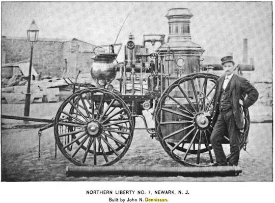 From “Industrial Interests of Newark” 1874 The fame of Newark for producing the best steam fire engines has greatly increased by the valuable inventions of Mr. J. N. Dennisson, now engaged in their manufacture at the above location. The variable pump, which has added so much to the efficiency of steam fire engines, is of Mr. Dennisson's own invention. As this pump is used in the construction of his machines, they have no points of inferiority compared with the best fire engines made. Mr. Dennisson also has patents on several pumps of different sizes, all of which go to make up the excellence of his productions. His other patents are a concentric ring piston, and an improved hose rivet, which latter adds 20% to the strength of hose. Not content with these great improvements, Mr. Dennisson has invented and patented an air pump, with large and small cylinders, for compressing air. His machines are all made in the crane neck style, with hose carriages constructed in a similar manner, and they are all light weight engines. They are capable of throwing the same quantity of water as engines weighing one-third more, and are so finely constructed as to permit of being run with or without fly wheels, and will not stop on the centre at any rate of speed. The piston pump is used, but with Mr. Dennisson's peculiar and superior manufacture, will not "jump" on the water any more than the rotary pump. It is only necessary to say that his productions have all the requisites of first class machines. They are sold in the largest cities of the Union, and meet with general approval. In a word, with light weight and easy running qualities, the Dennisson engine has all the powers and capabilities of the heavier machines made by other manufacturers, and the public may rest assured that it will keep pace in added improvements with the demands of the times. The crane neck hose carriages of this manufactory are provided with a patent brake, managed by the driver, on the hose reel Mr. Dennisson supplies with his engines the best qualities of leather and rubber hose, and also a general line of fire supplies. He employs 10 hands, the weekly payroll being $150. The annual production amounts in value to $30,000.