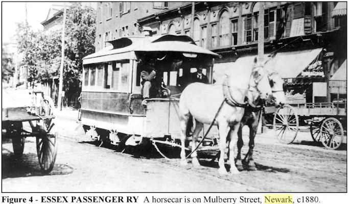 From Streetcars of New Jersey: Metropolitan Northeast The Essex Passenger Railway Company was chartered on March 24, 1874, with John McGregor, Sylvester S. Battin (president) and John Ballantine as directors. It began to consolidate the Newark operating streetcar companies and the Rapid Transit Street Ry of the City of Newark through either lease or stock purchase. in 1885, it aquired the Newark & Bloomfield lines and the Orange & Newark Railway. By 1887, it operated 50 miles of tracks and 138 cars with 702 horses. In 1889, the Essex Passenger Railway Company built the line on Avon Avenue, Irving Turner Boulevard, West Kinney and Washington Streets, and west two miles up Central Avenue. The line was five miles in length. This was also the year the Belleville Stables were enlarged for an additional 82 horses. The warren Street line was rebuilt in 1889. It began at the junction of the tracks on Orange Street, down West Market (Warren) Street, to Market Street and Springfield Avenue. On June 23, 1890, the Essex Passenger Railway Company was consolidated with the Hudson & Bergen Street Ry into the Newark Passenger Ry. This was a Philadelphia syndicate that would merge or control all of the lines in Newark and most of the surrounding areas.