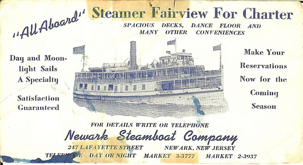 Thomas (Donato) Parrillo's excursion boat, the Fairview. His brother, Capt. Benjamin S. Parrillo, was at the helm. In the 1950's my great Uncle Benny served as a captain on the Staten Island Ferry. He owned and operated the Fairview in partnership with his brothers Carmen, Anthony and Donato Thomas Parillo (my grandfather). The Fairview's home port was Port Newark, and it made daily excursions from Newark to Asbury Park, making stops along the way at various towns along the coast, including Elizabeth, Keansburg and many others. It also made excursions northward to West Point. It was very popular, and many people used the boat to travel from town to town along its route, for example, boarding at Elizabeth and getting off at Newark. Photo from Marie Guarino Osterman |